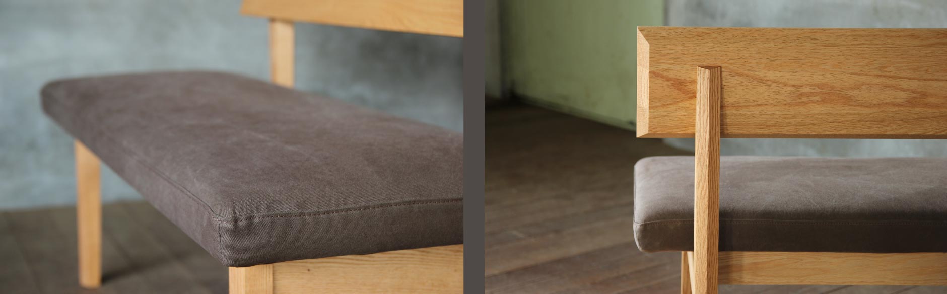 座り心地にこだわった背付きクッションベンチ。3層に重ねたウレタンが体をしっかり支えてくれます。また座面のカバーはファブリックの場合カバーリングになりますので、万が一汚してしまってもお手入れが可能です。またカバーを変えるだけなので模様替えも簡単です。