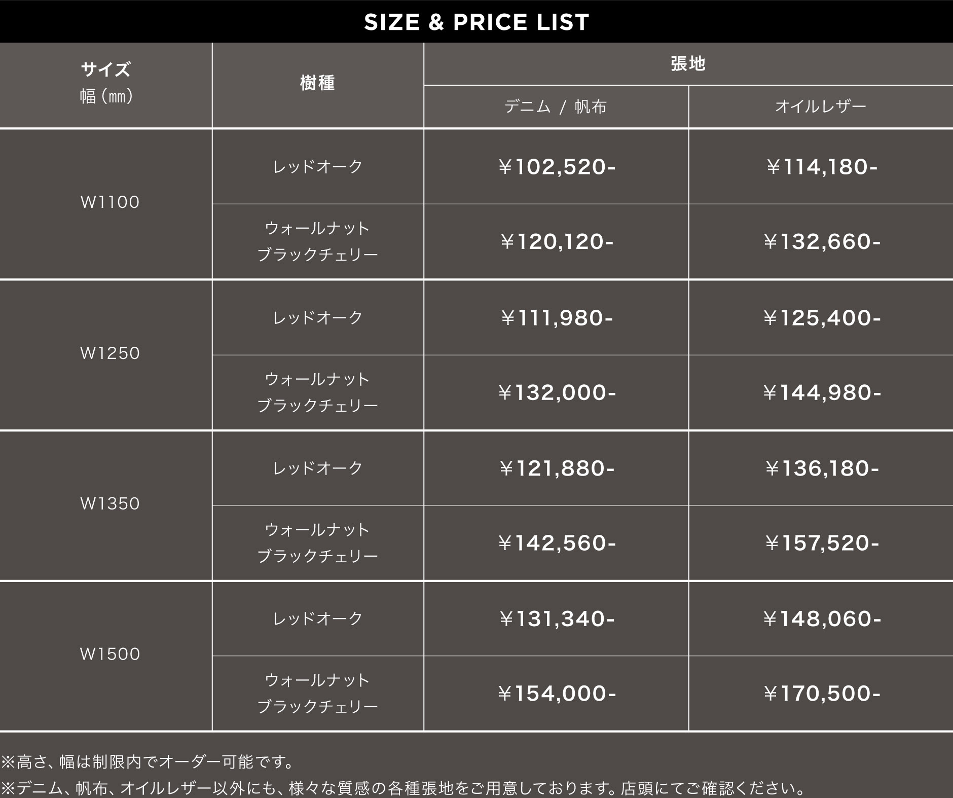 SOLIDでは木材に精通するプロの職人が厳選した無垢材のみを使用しており、ウォールナット、ブラックチェリー、レッドオークの3材種よりお選び頂けますので、お客様のお好みに合わせてオーダーが可能です。