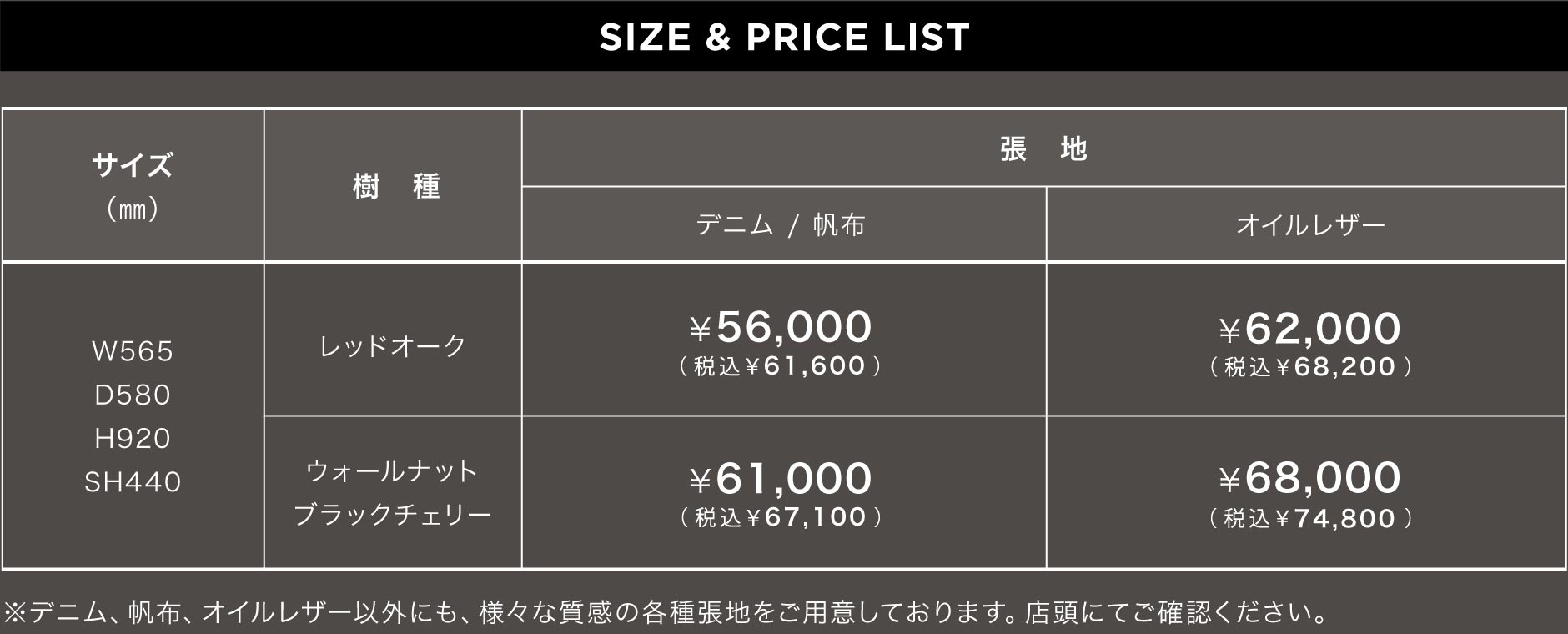 ファブリックであれば帆布やデニム、革ならオイルレザーなど、使い込む程に風合いが増していく自然素材を中心にご用意しております。ご自宅の雰囲気やお客様のお好みに合わせてお選び頂くことができます。